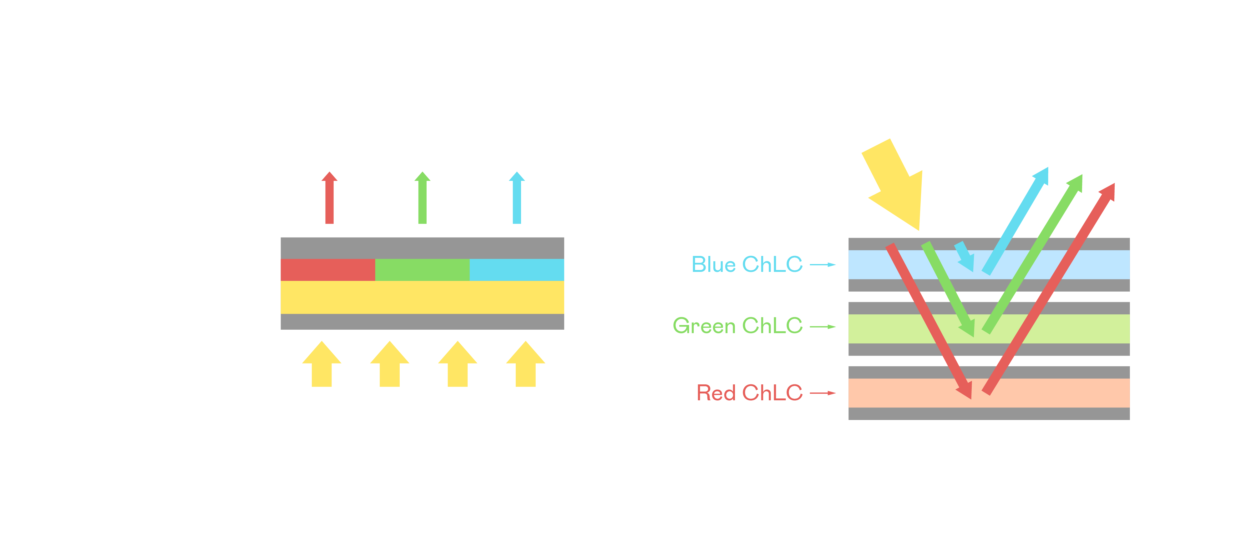 爱游戏胆固醇液晶显示器是由红、绿、蓝三层胆固醇液晶面板堆叠而成,并采用无彩色滤光片设计,减少环境光在反射过程中的损耗。
